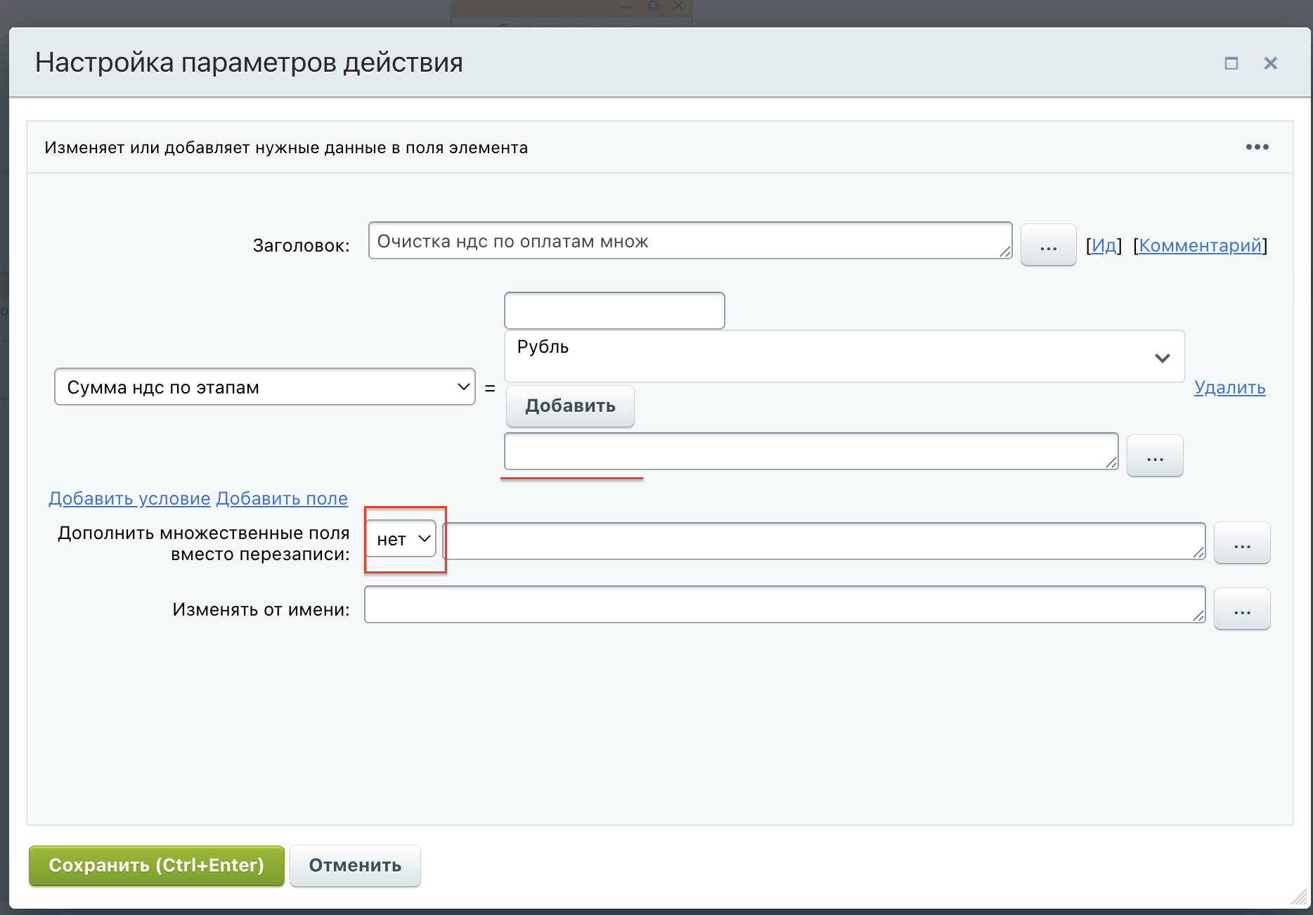 - Чтобы у юриста была возможность "откатить" расчеты и сделать их снова, нам нужно обнулить значения в поле и записать новое. Без обнуления в поле будет не 3 значения по этапам оплаты, а 6.